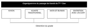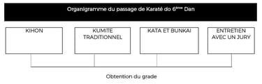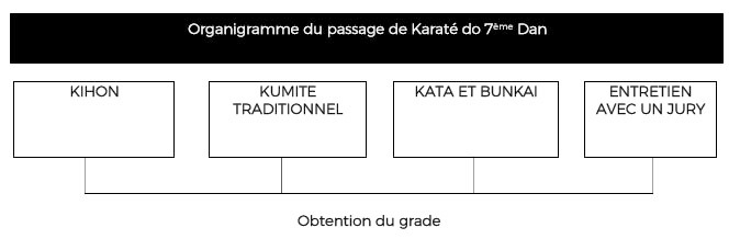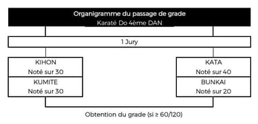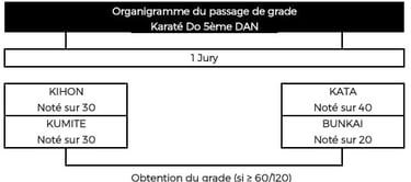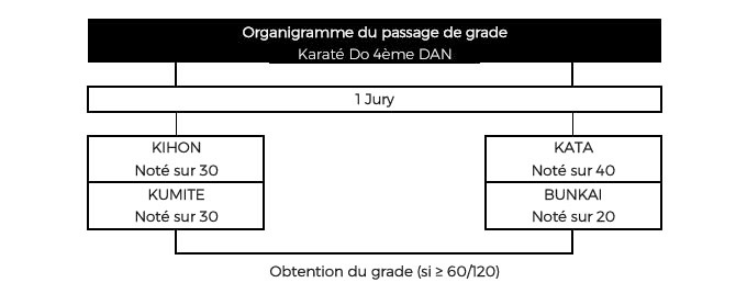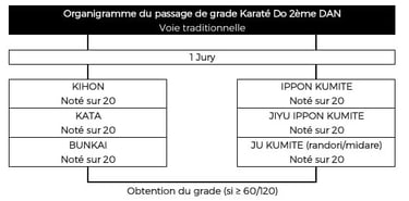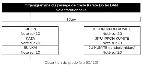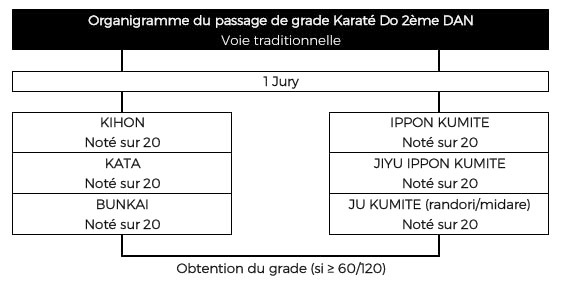 L’examen comporte un entretien avec un jury ainsi que 3 parties basées sur la connaissance technique du Karaté-Do. Pour l’obtention de l’examen le candidat doit obtenir la moyenne générale, soit 40 sur 80 points. Si le candidat n’obtient pas la moyenne générale, les notes des UV pour lesquelles il a obtenu une note supérieure ou égale à la moyenne (10/20) restent acquises définitivement. Dans ce cas, seules les UV n’ayant pas obtenu la moyenne devront être repassées jusqu’à obtention de la moyenne générale. Il n’y a pas de note éliminatoire. Le candidat ne pourra se présenter plus d’une fois par saison sportive à cet examen.