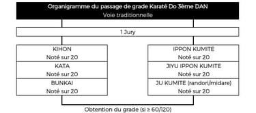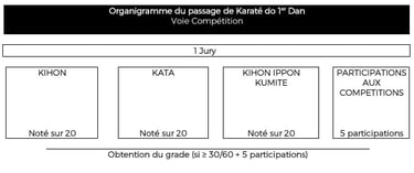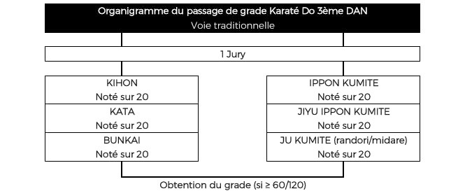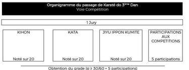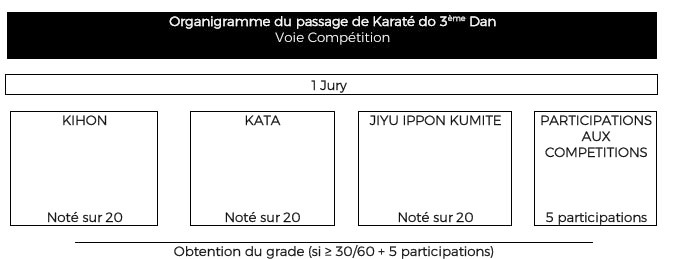 Un candidat qui choisit le passage de 3ème Dan voie « compétition » doit passer 4 épreuves, qui sont : 1/ Kihon 2/ Kata 3/ Jiyu Ippon Kumité 4/ Participation aux compétitions Les 3 épreuves : Kihon, Kata et Jiyu Ippon Kumité, sont notées par un jury composé de 3 juges. Le contenu de ces épreuves est identique à la voie « traditionnelle ».