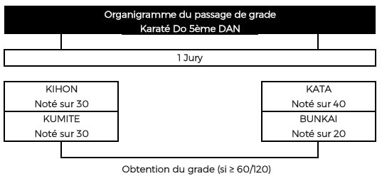 L’examen pour l’obtention du 5ème Dan est constitué de 4 épreuves : le kihon, le kumité, le kata et le bunkaï. Pour l’obtention de l’examen le candidat doit obtenir la moyenne générale, soit 60 sur 120 points. Si le candidat n’obtient pas la moyenne générale, les notes des UV pour lesquelles il a obtenu une note supérieure ou égale à la moyenne restent acquises définitivement. Dans ce cas, seules les UV n’ayant pas obtenu la moyenne devront être repassées jusqu’à obtention de la moyenne générale. Il n’y a pas de note éliminatoire. Le candidat est examiné par un jury composé de trois juges. Pour toutes les épreuves à 2, Le candidat est évalué avec un partenaire qu’il choisit parmi les candidats.